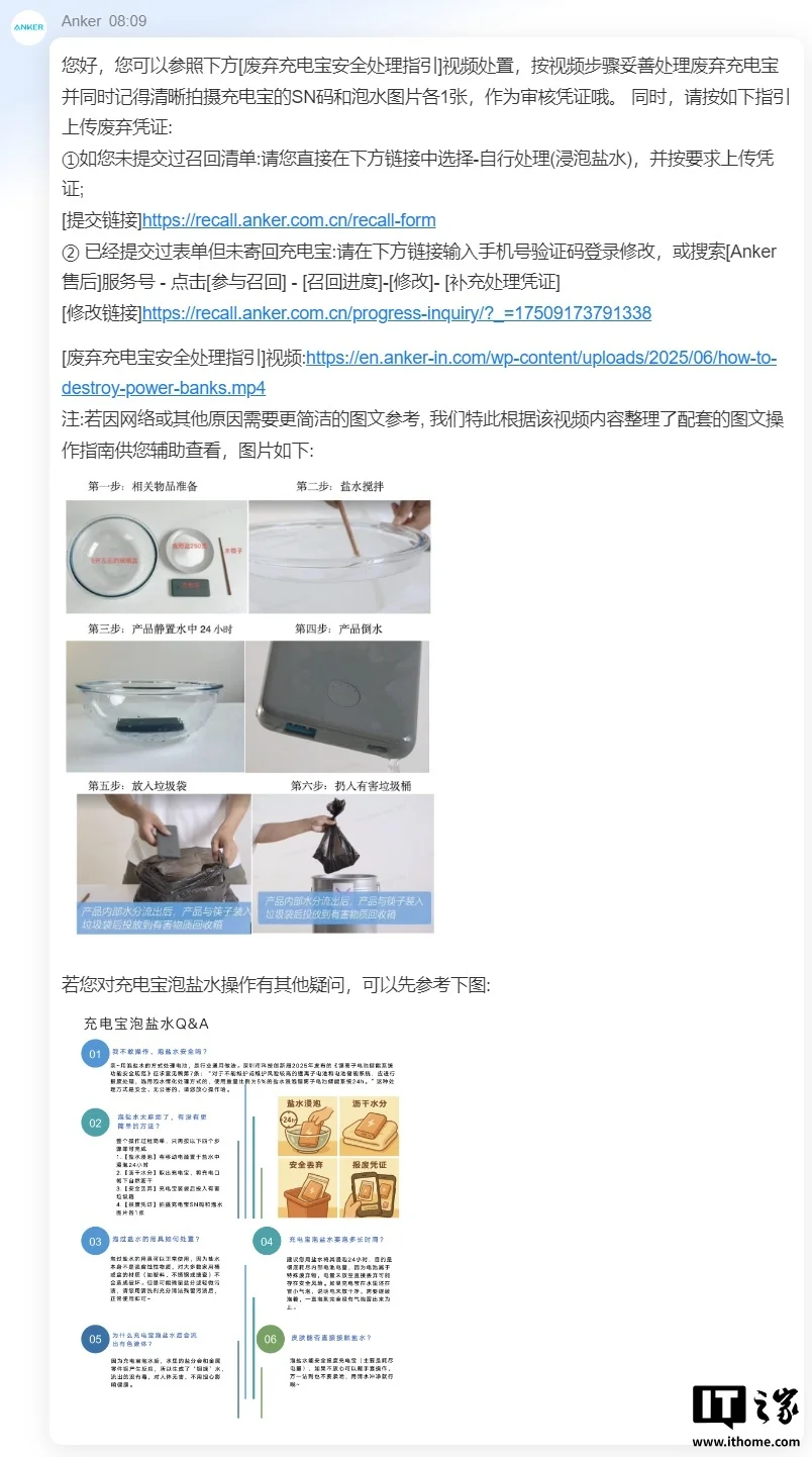 IT之家查询安克充电宝召回申请渠道发现,该公司确实给出了泡盐水的召回流程。官方称“将旧移动电源浸泡在盐水中 24 小时即可,目的是彻底耗尽内部电池电量,避免直接丢弃存在的潜在安全风险”。